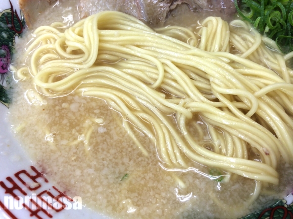 麺は中細ぐらいのストレート。何も指定しなかったのですが、茹で加減は割とカタメで提供。滋賀県の草津の名門で食べた時、やわ麺だったのでそちらを想像していましたが、意外にもカタメでした。加水は低そうなザックリ食感です。スープは鶏が主体なのでしょうか?背脂も浮いてはいますが、「こってり」というほど濃くはありません。微妙な酸味を感じるのは気のせいかな??