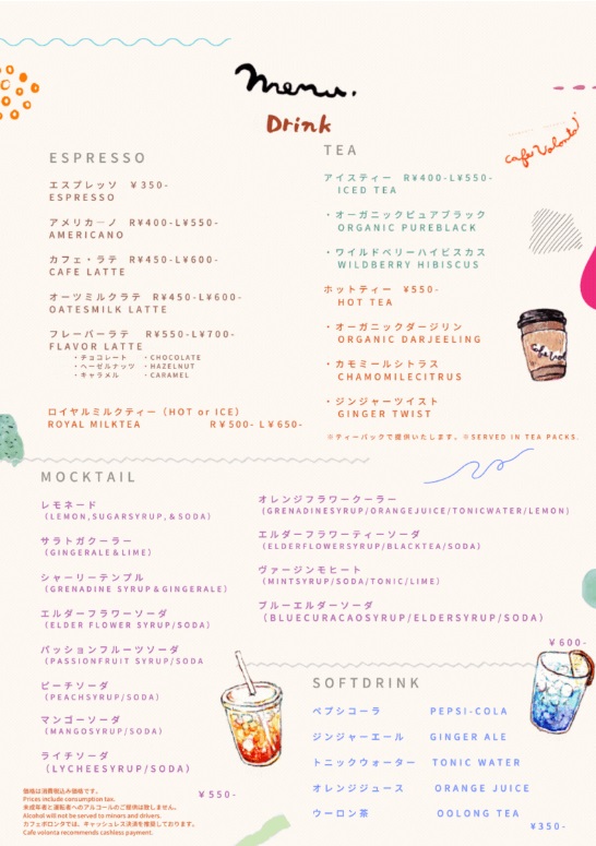 ドリンクメニューです。色んな種類がありますが、価格も高いのか安いのかカフェにほとんど行かない自分には分からん(笑)