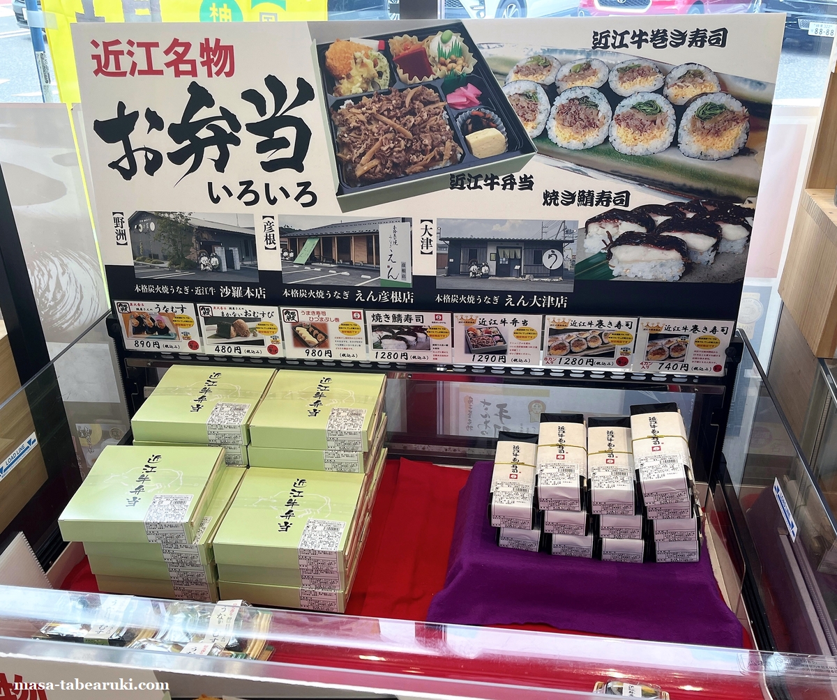 ふと目に付いたのが”近江名物 お弁当いろいろ”と書かれたこのコーナー。色んなお店の弁当が並んでいるのかと思ったのですが、どうやら違う模様で、野洲市にある本格炭火焼うなぎ・近江牛「沙羅」というお店とその関連のお店本格炭火焼うなぎ「えん」が弁当として提供されていました。