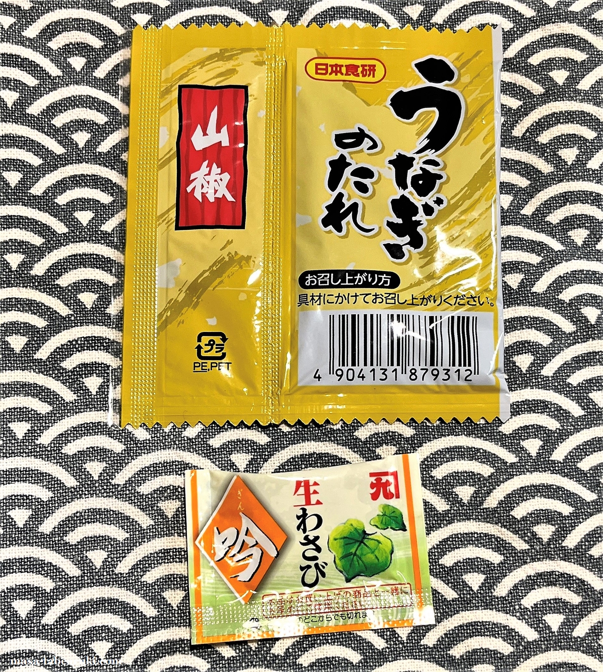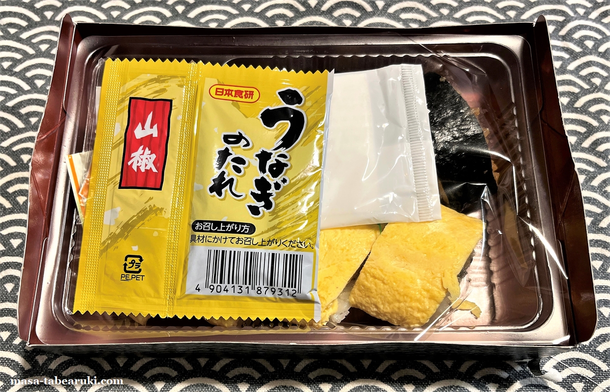 フタを開けると入っているのはうなぎのタレと山椒の小袋、山葵、そしておてふき。うなぎのたれはお店のものかと思ったら、日本食研と書かれていますね。