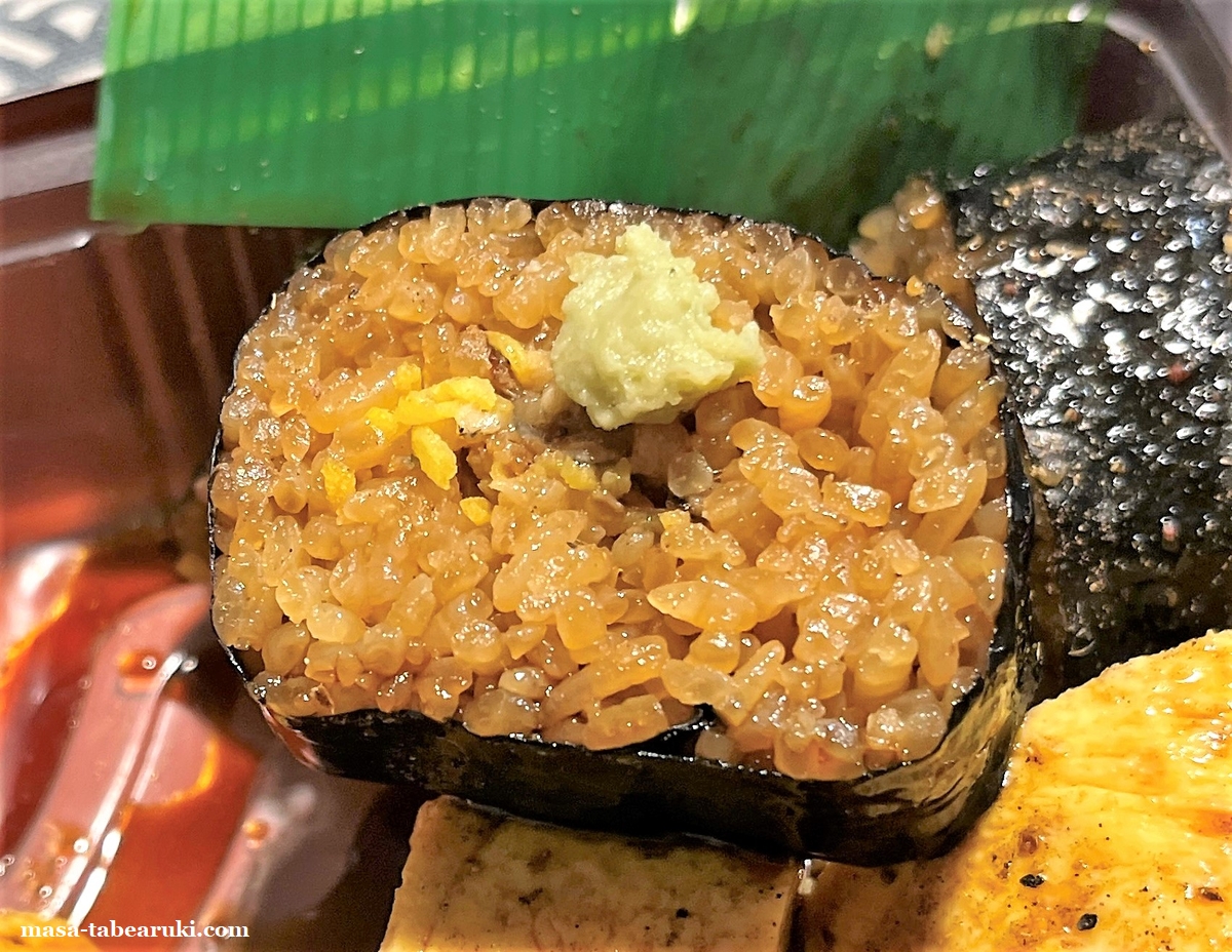 たれの染みたご飯を巻いたのり巻きで、真ん中にうなぎが入っていますが、これもやはり存在感は薄いかな。山葵との相性はなかなかのもの。